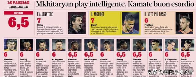 如《米兰体育报》给了他全场并列最高分的6.5分。但《罗马体育报》则给了他低分。
